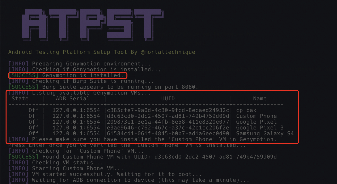 The script will prompt the user to configure burpsuite’s proxy settings. The script will get the proxy settings and ask the user to set the details on the android vm’s network proxy settings.